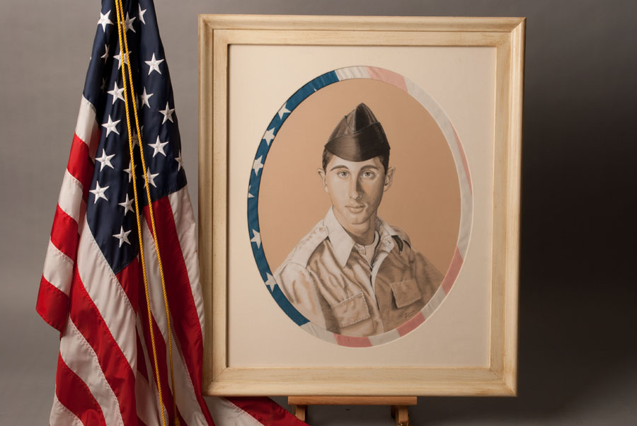 This was the first portrait I ever created as well as my first attempt at matting and framing. The mat was made in honor of the actual flag that was raised the day he left for Iraq and not lowered or removed until the day he returned, safe and sound. Its’ measurements are 26x30 inches and was done in black and white charcoal medium.