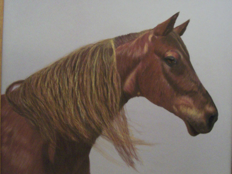 This is Bea, a former blue ribbon winner. At the time of this portrait, Bea was 29 years old. The challenge was using her current bone structure to get the correct details needed along with an old photograph of her younger years for color flow to create an exact likeness of this once vibrant Morgan. Bea measures at 20x24 inches and was done in pastel medium.