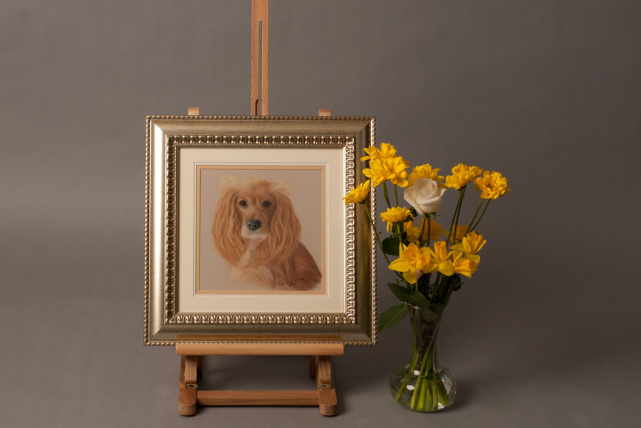 Lilly was a special piece as I personally knew her for most of her life. She was also my first attempt at fur. I quickly realized that I truly enjoyed duplicating an exact likeness of Sue’s sweet, lost “Fur Baby.” Lilly was created with pastels and measures 10x10 inch square. The mat and frame are the perfect compliment to her unique coloring.