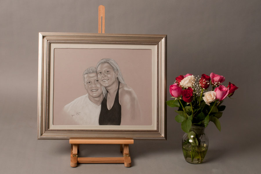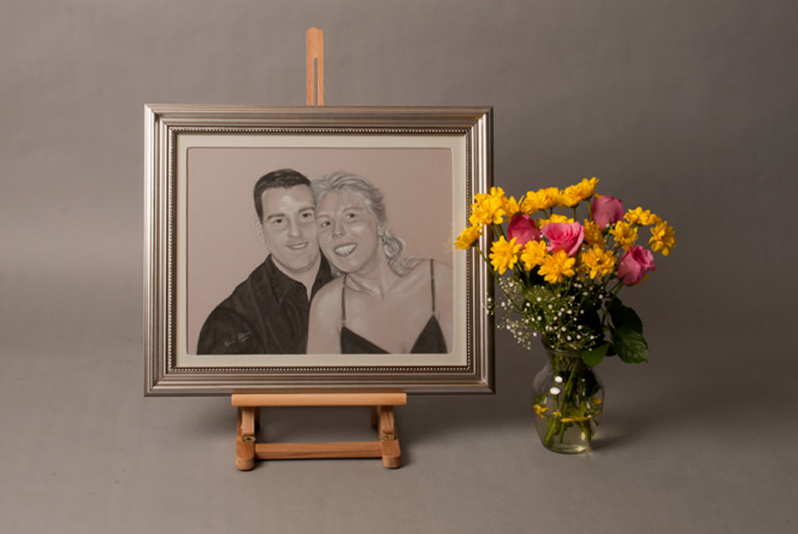 These young honeymooners were produced using black and white charcoal. Frame size measures 16x20 inches. Custom matting and framing allows perfect compatibility to the subject(s).